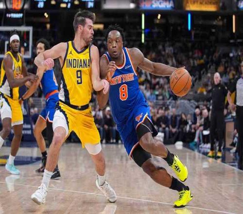 尼克斯上一場客場134-117戰勝爵士,步行者過去11場遭遇11連敗位列聯盟倒數第一,本賽季前兩次交鋒雙方各取一勝。本場尼克斯缺少唐斯、哈特、索漢、麥克布萊德,步行者缺少哈利伯頓、西亞卡姆。首節前5分鍾雙方纏鬥至8-8,尼克斯內外開花一波9-0攻勢取得領先,托平三分追分。布倫森中投得分,步行者連追5分,尼克斯維持微弱領先優勢,首節比賽結束尼克斯24-21領先步行者。首節步行者三分11中3,尼克斯三分6中1,布倫森9中5得到11分。