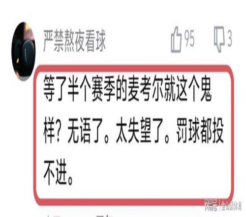 麥考爾糟糕的表現,也讓廣東球迷大失所望,紛紛在網絡平台吐槽。“等了半個賽季的麥考爾就這個鬼樣?無語了。太失望了。罰球都投不進。”;“看了兩場球,運球和突破能力弱的一逼,水平太一般了,沒啥硬解能力!”;“打了兩場了,啥水平看不出來嗎?而且大傷了,不知道哪的自信?”;“不要懷疑朱杜選外援的眼光,從來沒有選到一個能打球的。”……