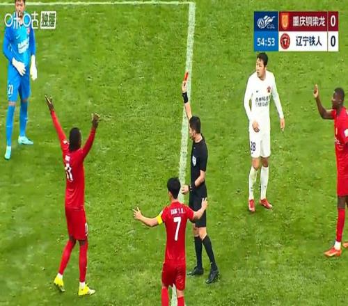 下半場,重慶銅梁龍加強進攻,效果終於在第58分鍾時呈現。外援肯帕努帶球突破到禁區外,客隊外援瓦吉奇鏟球放倒。由於是最後一名防守球員,主裁判馬寧當機立斷掏出紅牌將其罰下,遼寧鐵人開始少打1人。