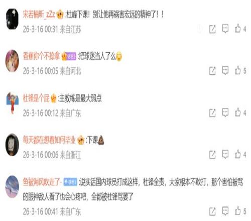 不過在輸球之後,杜鋒已經遭遇眾怒了。特別是官方在發布比賽結果之後,可以看到評論區全部都是謾罵杜鋒的,紛紛希望他下課,在最近兩場比賽已經連續出現了,確實他現在的執教一塌糊塗。