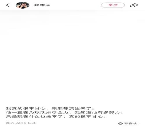 邦本萌寫道:“我真的很不甘心,眼淚都流出來了。他一直在為球隊拚盡全力,我知道他有多努力。隻是現在什麽也做不了,真的很不甘心。