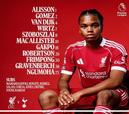 利物浦首發:1-阿利鬆、26-羅伯遜、4-範戴克、2-喬-戈麥斯、30-弗林蓬、38-赫拉芬貝赫、8-索博斯洛伊、10-麥卡利斯特、7-維爾茨、18-加克波、73-恩古莫哈