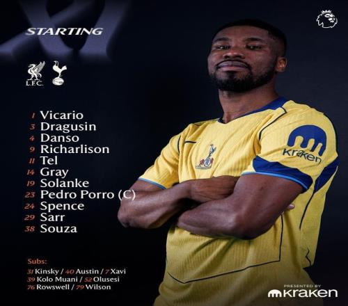 熱刺首發:1-維卡裏奧、3-德拉古辛、4-凱文-丹索、23-波羅、38-索薩、29-帕普-薩爾、14-阿奇-格雷、24-斯彭斯、11-馬蒂斯-特爾、9-裏沙利鬆、19-索蘭克