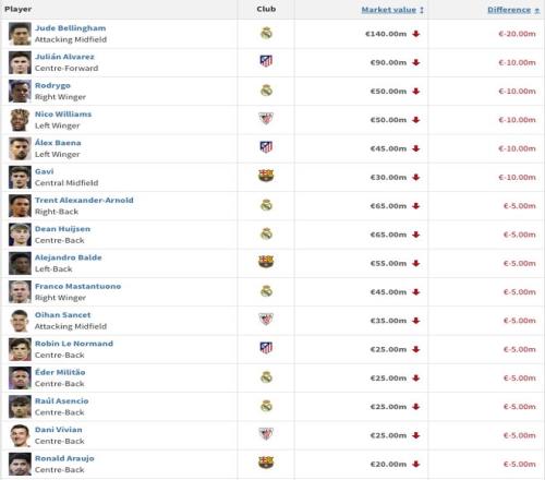 跌1000萬歐5人:阿爾瓦雷斯(馬競,9000萬歐),羅德裏戈(皇馬,5000萬歐),尼科-威廉斯(畢爾巴鄂競技,5000萬歐),巴埃納(馬競,4500萬歐),加維(巴薩,3000萬歐)