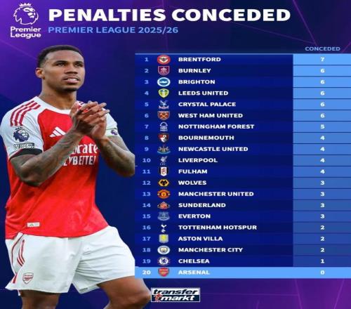 本賽季英超點球丟球榜:布倫特福德7球第1,阿森納0球