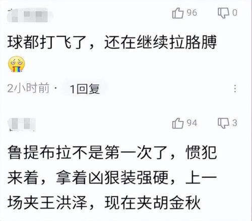 廣東球迷也表達了不滿:魯吐布拉這不是第一次了,慣犯來著,拿著凶狠裝強硬,上一場夾王洪澤,現在夾胡金秋;這種動作要停賽,直接對人,太惡劣了。