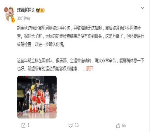 胡金秋傷情出爐:初步檢查胳膊沒有傷到骨頭還需進行核磁確認_24直播網