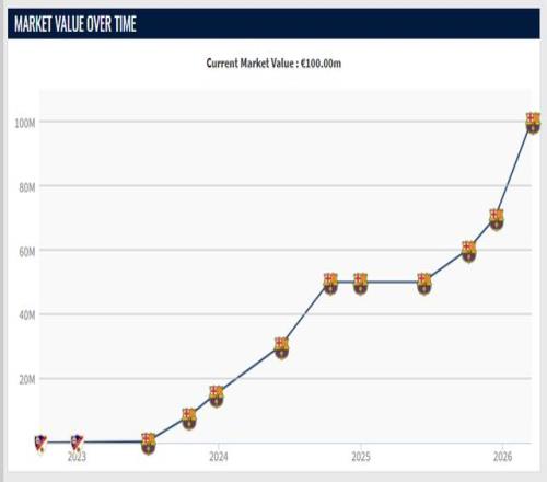2023年初,費爾明的身價為10萬歐元;2023年夏天,費爾明進入巴薩一線隊,到10月份,完成巴薩首秀的費爾明,身價漲到800萬。在巴薩站穩腳跟之後,費爾明的身價不斷攀升,1500萬、3000萬、5000萬……去年10月,費爾明身價漲到6000萬,12月達到7000萬,最新一期飆升至1億!