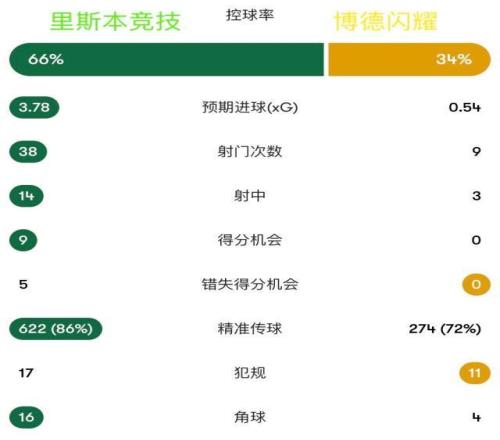 裏斯本競技全場射門38次,射正14次,預期進球3.35。自2003-04賽季Opta有記錄以來,這是葡萄牙球隊在歐冠單場並列最多的射門次數,上一次是布拉加在2012年9月對克盧日時的38次。