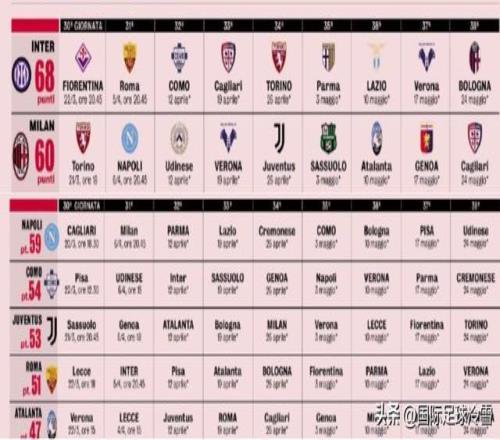 相對而言,國米最後階段要對陣佛羅倫薩等拚保級的球隊,要對上羅馬、科莫等為歐冠資格玩命的球隊。AC米蘭則要同那不勒斯、尤文圖斯、亞特蘭大等多支爭奪歐戰資格的對手捉對廝殺。