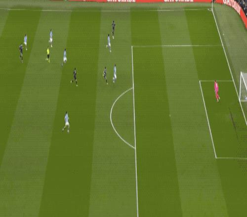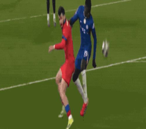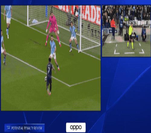 顯示維尼修斯高速插上的射門擊中立柱彈出,接下來,維尼修斯的射門被B席擋出。比賽進行了將近5分鍾,蒂爾潘吹停,VAR介入,維尼修斯並不越位,B席門線上手球犯規,被紅牌罰下,這才有了維尼修斯的點球。