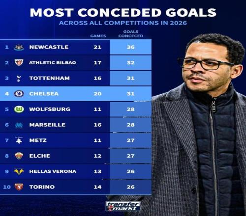 北京時間3月18日,切爾西在歐冠1/8決賽次回合的比賽中主場0-3完敗於巴黎聖日耳曼,兩回合總比分2-8被淘汰出局。與此同時,根據德轉的統計,藍軍2026年各項賽事的丟球數已經達到了31球,同期歐洲五大聯賽球隊並列第三多,與近況糟糕的熱刺相同。