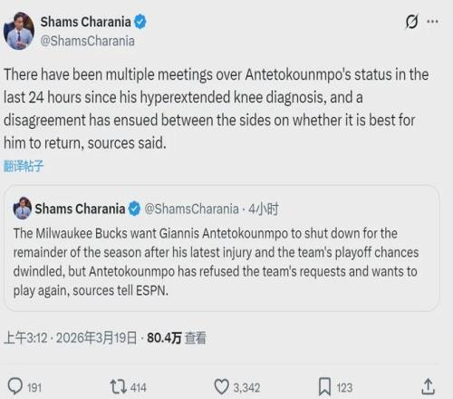 北京時間3月19日淩晨,據NBA名記Shams報道,雄鹿管理層要求字母哥在最近一次受傷後賽季報銷,因為球隊的季後賽希望已經非常渺茫。但字母哥拒絕雄鹿的要求,他想在本賽季重返賽場,雙方舉行了多次會議,產生明顯分歧。