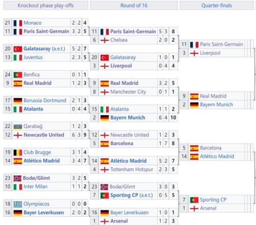 最終,巴黎聖日耳曼、利物浦、皇家馬德裏、拜仁慕尼黑、巴塞羅那、馬德裏競技、裏斯本競技、阿森納晉級1/4決賽。八強由西甲3隊、英超2隊、德甲法甲葡超各1隊組成。