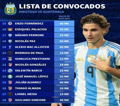北京時間3月19日,在阿根廷國家隊公布新一期大名單之後,德轉也列出了阿根廷隊此次28人大名單的身價排行榜,胡利安-阿爾瓦雷斯和恩佐-費爾南德斯同以9000萬歐元並列第一,麥卡利斯特8000萬歐元第三,梅西1500萬歐元。