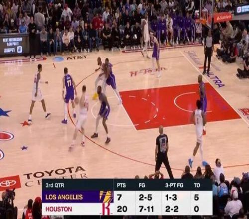 第三節風雲突變,火箭轟出20-7攻擊波,失誤對比湖人5次火箭0次,火箭一舉追平反超,扭轉了局勢。