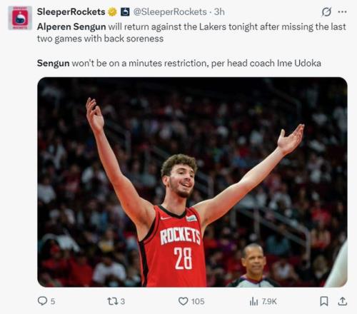 火箭官方寫道:申京在複出後拿到了兩雙數據。