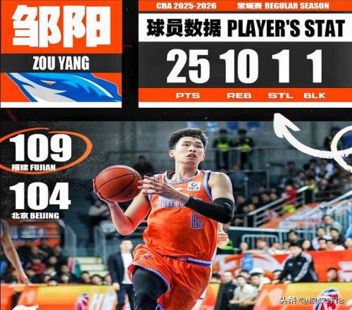出眾的防守判斷和閱讀比賽能力,鄒陽屢次站出來完成關鍵得分,尤其是並不穩定的外線投籃也投開了,一度打停北京男籃。