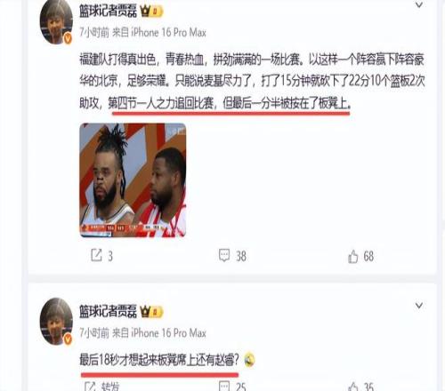 北京球迷也紛紛鞭撻主教練許利民,“許利民這用人是真牛批,第四節關鍵時候上方碩和張才人,這倆小天才一通亂搞,一個亂扔,一個亂犯規,本身靠麥基一波打籃下追上了,後邊全是外邊亂扔又給送回去。”許利民沒有用足用夠用好麥基,打得最好的他隻打了16分鍾,而其他外援和周琦上場時間均比他多,連0分的張才仁也比麥基多打了7分鍾。球迷怒問為何第一外援隻打了16分鍾?球迷調侃:“別的隊限製不了麥基,老許可以”、“膿包竟是許大師自己”。顯而易見,京媒京迷一致把矛頭對準許利民,認為他才是輸球的最大膿包。諸位,你們認為呢?