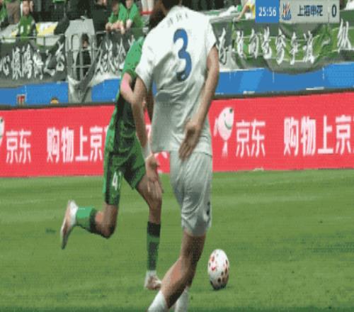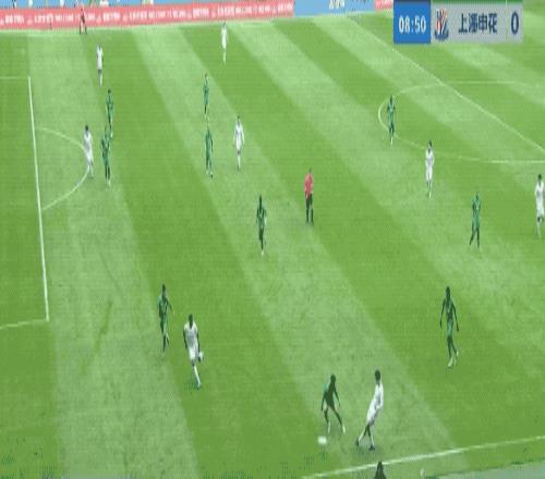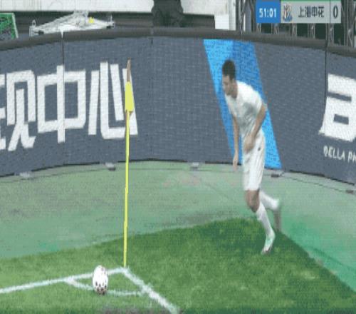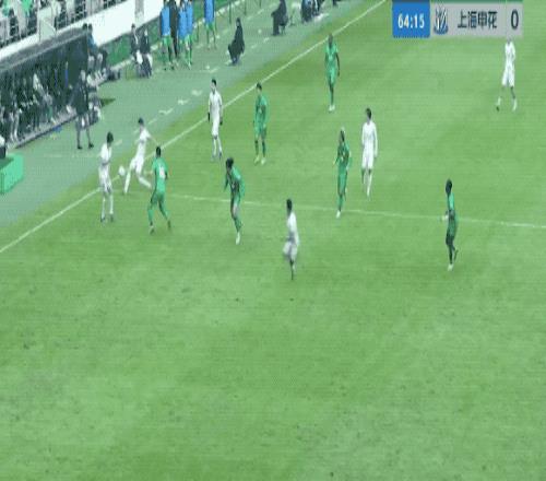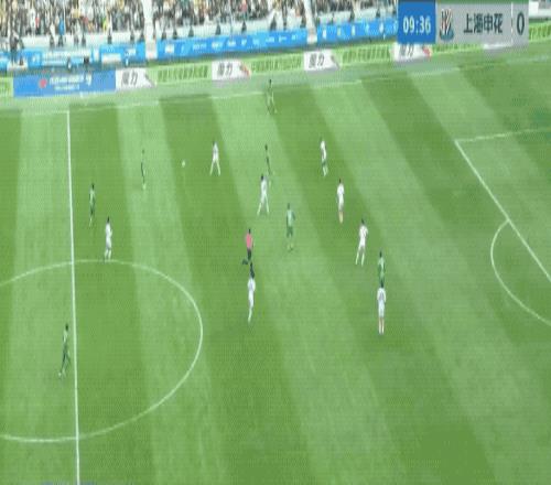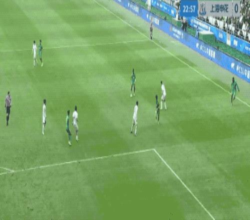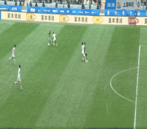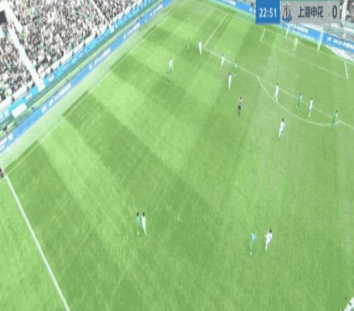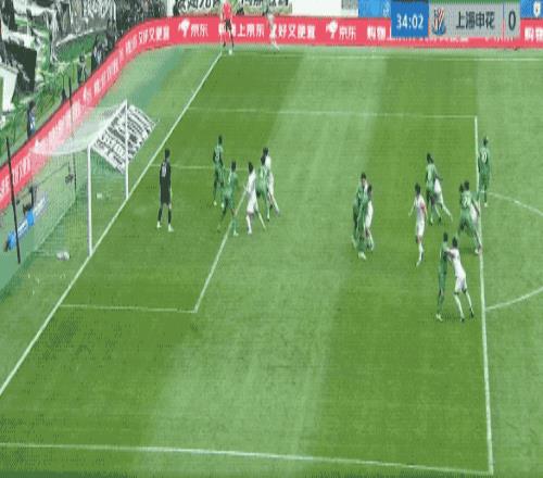 第50分鍾,申花的角球幾經波折終於開出,陳晉一在賈非凡的幹擾下回頭望月,皮球擊中邊網。