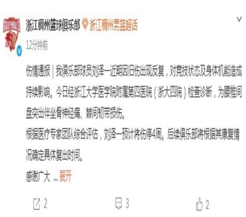 北京時間3月21日,浙江男籃官方公布球隊本土頂薪內線劉澤一傷病情況,他近期因舊傷出現反複,前往醫院檢查後確診為腰椎間盤突出伴坐骨神經痛、棘間韌帶損傷,預計將傷停4周。