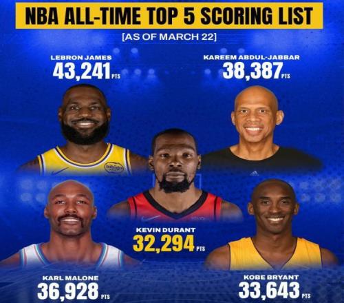 曆史得分榜前四人分別是詹姆斯(43241仍在增加)、賈巴爾(38387)、馬龍(36928)、科比(33643)。科比目前領先杜蘭特1349分,馬龍領先4634分,賈巴爾則領先6093分。