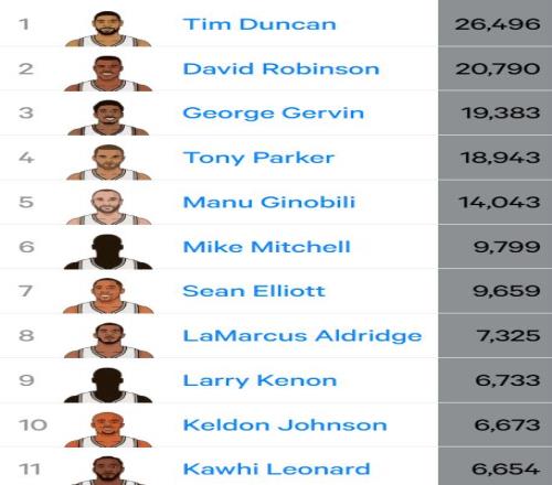 在得到這24分之後,凱爾登馬刺生涯總得分達到6673分,超越倫納德(6654分),升至隊史第十,且距離前麵第九的拉裏肯農(6733分、馬刺70年代名宿)也隻差60分,不出意外的話,本賽季就能實現超越。
