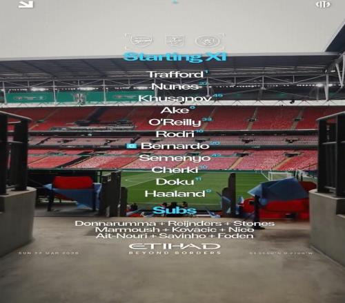 曼城首發:1-特拉福德、27-努內斯、45-胡桑諾夫、6-阿克、33-奧賴利、16-羅德裏、20-貝爾納多-席爾瓦、42-塞門約、10-謝爾基、11-多庫、9-哈蘭德