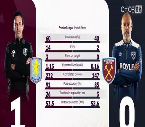 半場結束,維拉暫時主場1-0領先西漢姆聯。上半場比賽,維拉狂轟14腳射門3次射正打入1粒進球,埃梅裏似乎對於球隊的進球轉化率不是非常滿意,中場休息時表情嚴肅的走向更衣室。