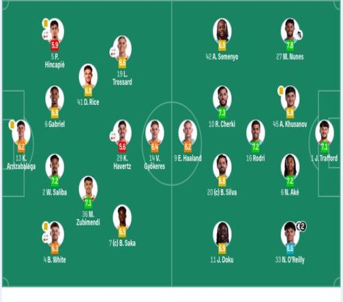 阿森納首發:13-凱帕、2-薩利巴、4-本·懷特(82’9-熱蘇斯)、5-因卡皮耶(67’33-卡拉菲奧裏)、6-加布裏埃爾、36-蘇維門迪、41-賴斯、7-薩卡、29-哈弗茨(67’20-馬杜埃凱)、19-特羅薩德(82’11-馬丁內利)、14-約克雷斯。