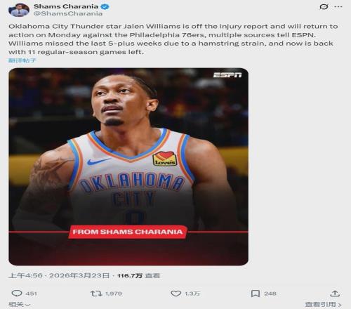 北京時間3月23日,據NBA名記Shams報道,雷霆二當家傑倫-威廉姆斯從傷病名單中移除,將於明天對陣費城76人的比賽中複出。傑倫-威廉姆斯此前遭遇腿筋拉傷,最近兩個月隻打了2場比賽。如今常規賽僅剩11場,他堪稱壓哨複出。