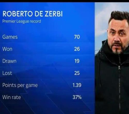 現年46歲的德澤爾比2022年9月至2024年6月曾經執教過布萊頓,期間他率隊在英超出戰了70場比賽,總成績為26勝19平25負,場均積分為1.39分,勝率為37%。