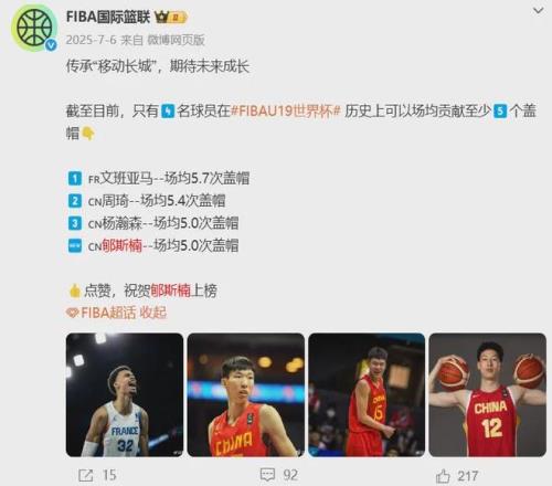 迄今為止,隻有四名球員能在U19世界杯場均5帽,另外三位是文班亞馬(法國)、楊瀚森和周琦,他們均通過選秀進入了NBA。